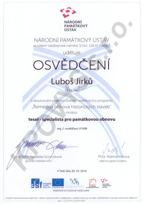 Naše firma je členem CECHU klempířů, pokrývačů a tesařů ČR a vlastníme osvědčení Národního památkového ústavu "tesař - specialista pro památkovou obnovu"
